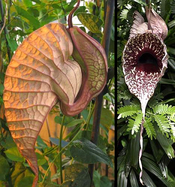 巨花馬兜鈴學(xué)名為“Aristolochia grandiflora”。這種植物的奇特之處在于它們美麗而怪異的花朵。花朵的主要部分只有一片,看起來(lái)好象是一個(gè)巨大的、帶有紋理的兜狀物,而不像普通的花朵那樣擁有對(duì)稱(chēng)的花瓣。觀賞者千萬(wàn)不要太靠近它,否則它所發(fā)出的死老鼠味道會(huì)在你們身邊數(shù)小時(shí)不散。不過(guò),巨花馬兜鈴雖然會(huì)發(fā)出死老鼠味道,但它們并不像巨型豬籠草那樣吃老鼠,它們這種氣味不過(guò)是用來(lái)吸引傳粉昆蟲(chóng)幫助它們傳粉而已。